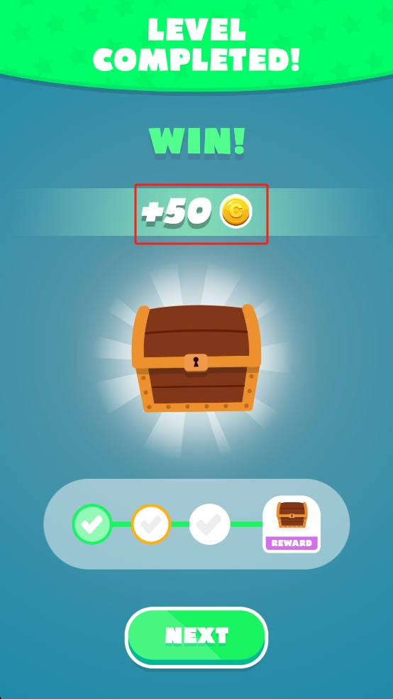 3、成功通关后,可获得50金币奖励以及宝箱。点击绿色的“NEXT”按钮,即可进入下一关。积累的金币能够在左上角的商店中使用。