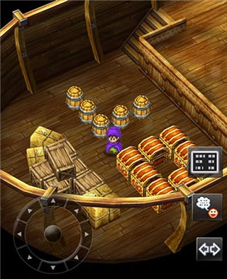 走出房间我们发现,原来我们是在一艘船上,这里需要我们调整一下视角才可以看到船帆后面的木桶,经常玩RPG游戏的玩家应该都和小编一样有个习惯,那就是每到一个场景都要把各个地方都搜刮一遍,玩勇者斗恶龙5也不例外。在开始的房间和甲板上我们先把柜子、图书架以及这些木桶全都搜查一遍,可以获得一些道具和物品。