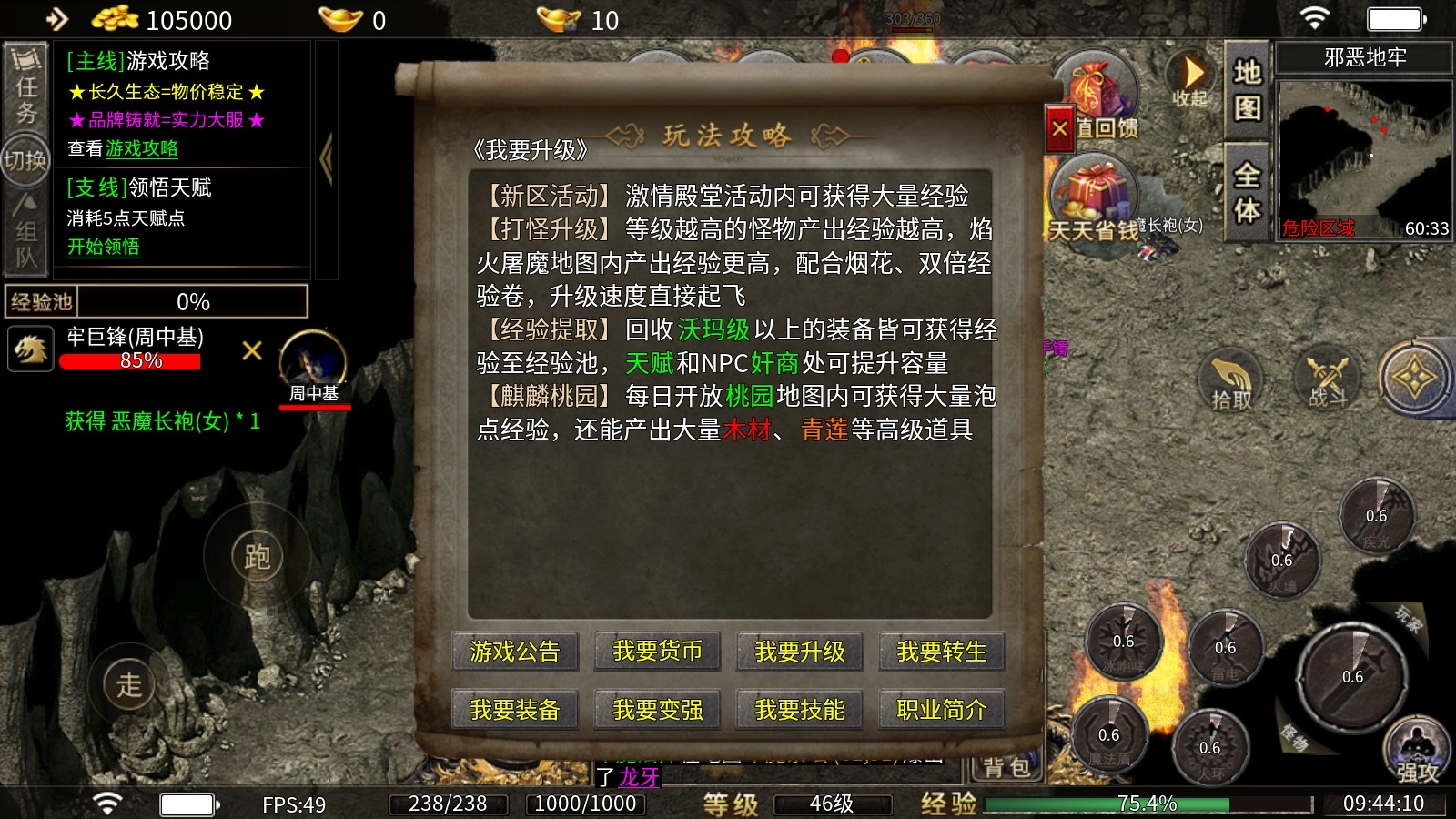 2、【打怪升级】:等级越高的怪物产出经验越高,焰火屠魔地图内产出经验更高,配合烟花、双倍经验卷,升级速度直接起飞。