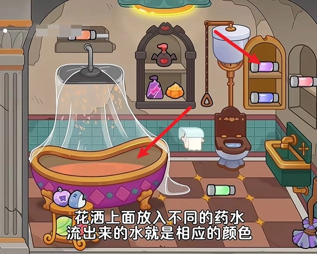 7、然后来到浴室当中,打开镜子就能看到各种颜色的染色剂,倒入浴缸就能改变水的颜色。