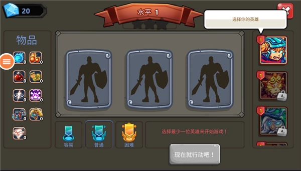 3、之后我们需要选择英雄,可选择3个进入,同时在旁边还有着物品栏;
