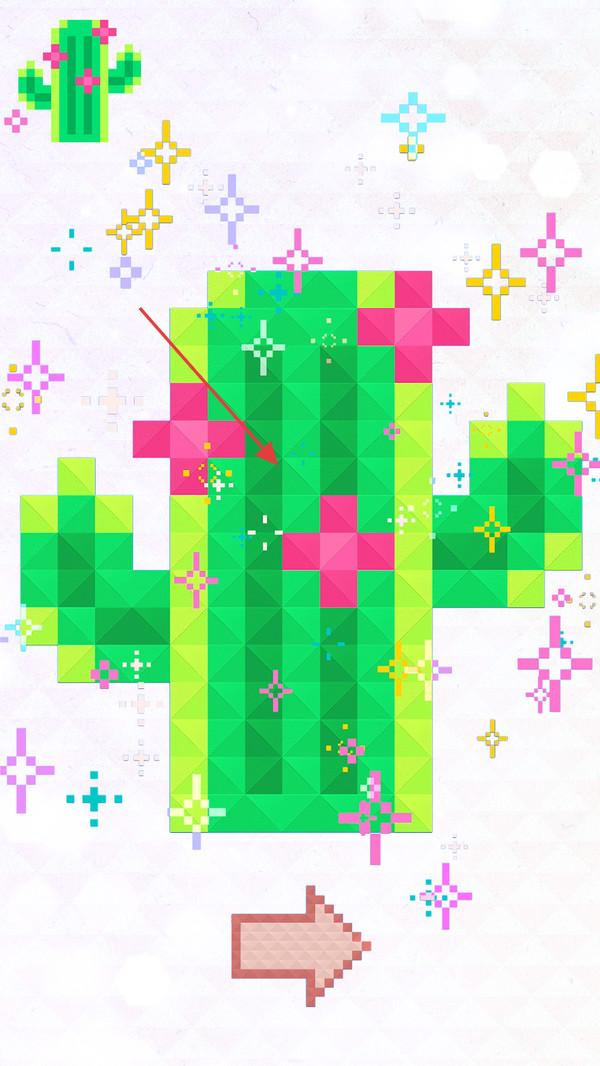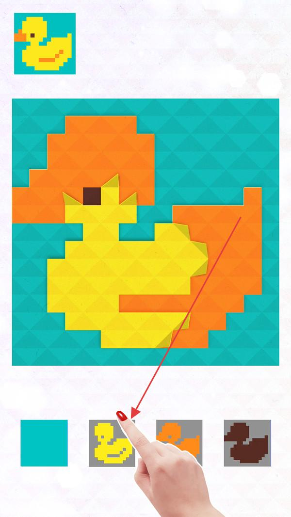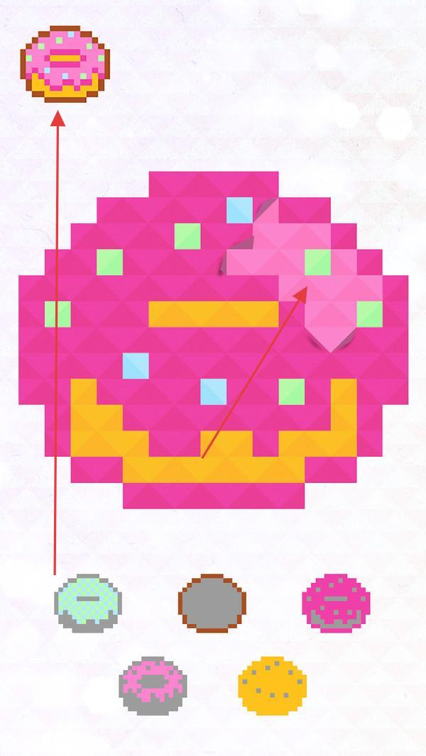 1. 进入关卡之后,将注意力集中在目标像素图案上(像小黄鸭、甜甜圈这类),与此同时,关注下方可供选择的像素块。