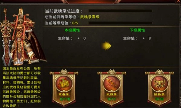2、武魂录升级攻略:首先着重收集常见的装备以及怪物相关信息,通过这种方式迅速提升武魂录等级,从而获取基础属性。