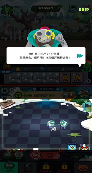 3、哟!终于生产了1阶士兵!那就来合并僵尸吧!拖动僵尸进行合并!