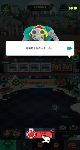 1、打开僵尸王国游戏后,玩家需先用药水生产士兵;