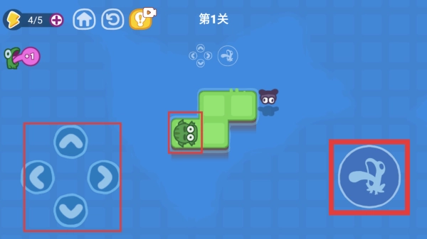 2、点击左下角按键控制青蛙在方块上移动,靠近苍蝇后点击右下角按键即可吞食。