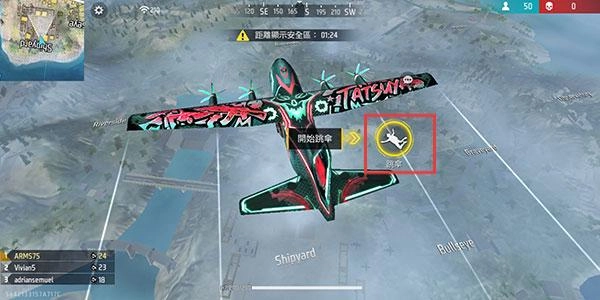 2、进入游戏后,会存在一段准备时间。当倒计时结束,玩家需搭乘飞机前往战场,点击跳伞后,战斗随即开启。