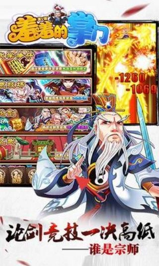 3、参与论剑竞技(红箭头),选养成侠客,挑战其他玩家,比拼战力(-1260/-1069),争夺“宗师”称号。