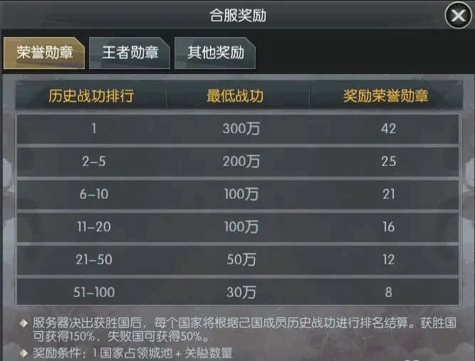2、失败国或处于和平轮回状态的国家,仅依据战功排行榜获取少量轮回勋章,不会额外获得王者勋章。