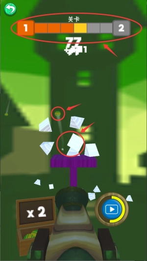 2、点击屏幕发射炮弹,通过触控调整射击角度和力度,精准命中远处的方块建筑获取积分。