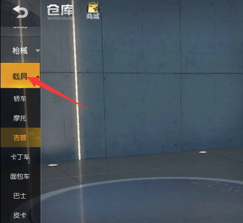 2、当你进入游戏仓库后,在界面左侧找到并点击载具栏,在此处你便能看到自己所拥有的汽车皮肤。