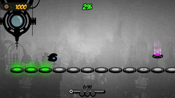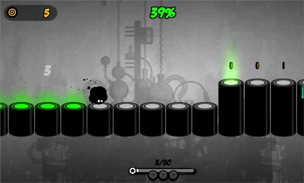 《永不言弃2》的玩法与《永不言弃》相比,基本没什么变动。游戏里每一关,只需让小墨点抵达终点就行。虽说理论如此,但实际操作起来,可就没那么简单了。在操作上,玩家全程仅需在屏幕上点击。当小墨点落地时点击,就能实现完美起跳,唯有如此,才能真正完成一次大幅度跳跃。