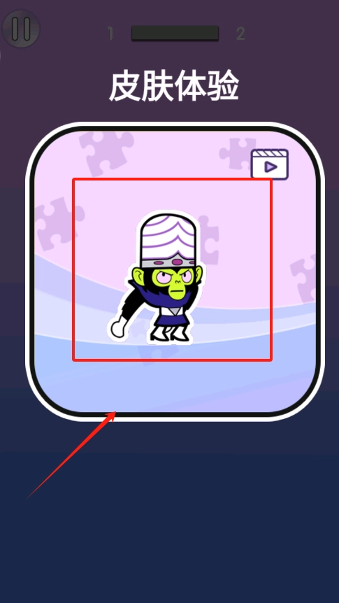 2、向右滑动屏幕选择皮肤体验界面,点击红色箭头指向的卡通角色预览装扮效果。