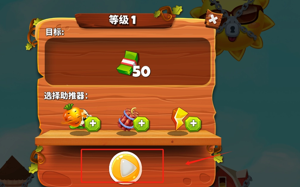 2、看到等级1界面,点下方红色框的黄色播放按钮,就能开始消除50个绿色物品挑战。