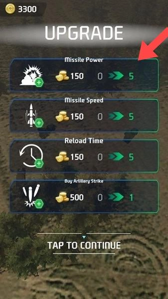 3、利用金币在【UPGRADE】界面升级【MissilePower】等属性,提升战斗能力。