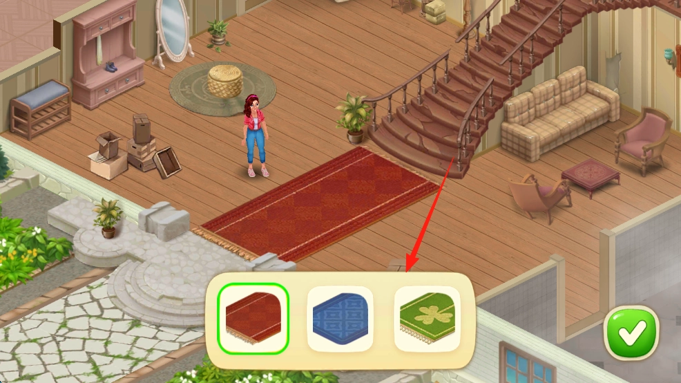 2、接收任务,挑选地毯,放置合适位置,确认装饰,开启新任务。