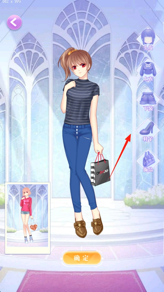 1、进入衣帽间(红箭头),查看角色当前穿搭,点击【衣橱】,浏览服饰库,选新单品(上衣下装),替换搭配。