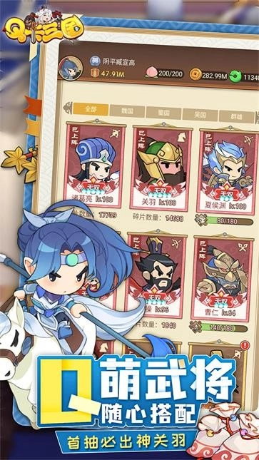 3、游戏里的英雄均以阿Q萌的形象呈现,来自三国的100多位武将组成了丰富多元的英雄阵容。