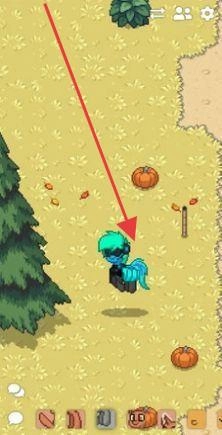 1、在草地场景,操控蓝发角色,沿箭头移动,靠近南瓜,进行采集互动。