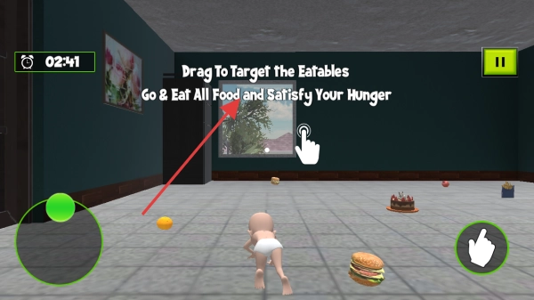 2、按照提示【Drag To Target the Eatables】,通过拖动操作让宝宝进食,以满足其饥饿值。