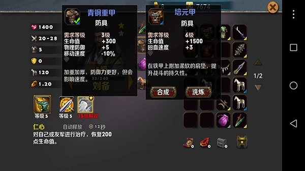 图一的情况想必大家都清楚,就不多赘述了,咱们重点来讲讲图二。当你耗费战功购置了大量宝箱后,会出现不少废弃装备。此时,你可以利用合成功能,三件同颜色的装备有33%的概率合成出一件高一级的装备(我个人感觉这个成功率挺不错的,我自己就成功了好多次,目前最高合成到黄色装备)。另外,主合成推荐选择防具(要是你和我一样合成出下面这张图里的装备,那可就恭喜你了,你的英雄血量起码能翻倍)。装备相关内容就讲到这里。