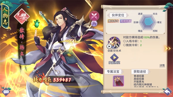 搭配详解:伙伴散修·韩立的技能可对敌方横排造成伤害,搭配红线遁光针的提升暴击属性,可产生巨额输出。