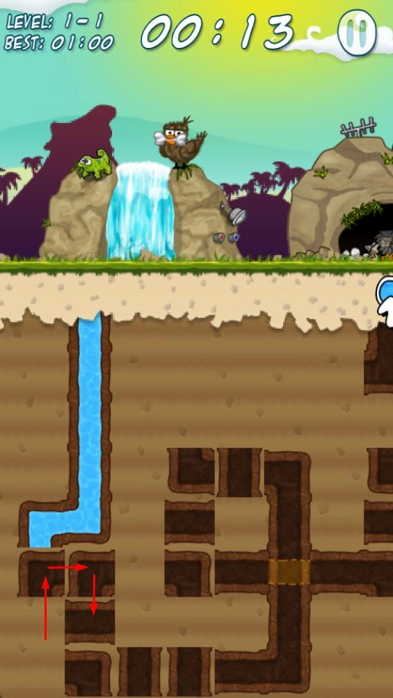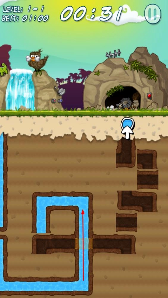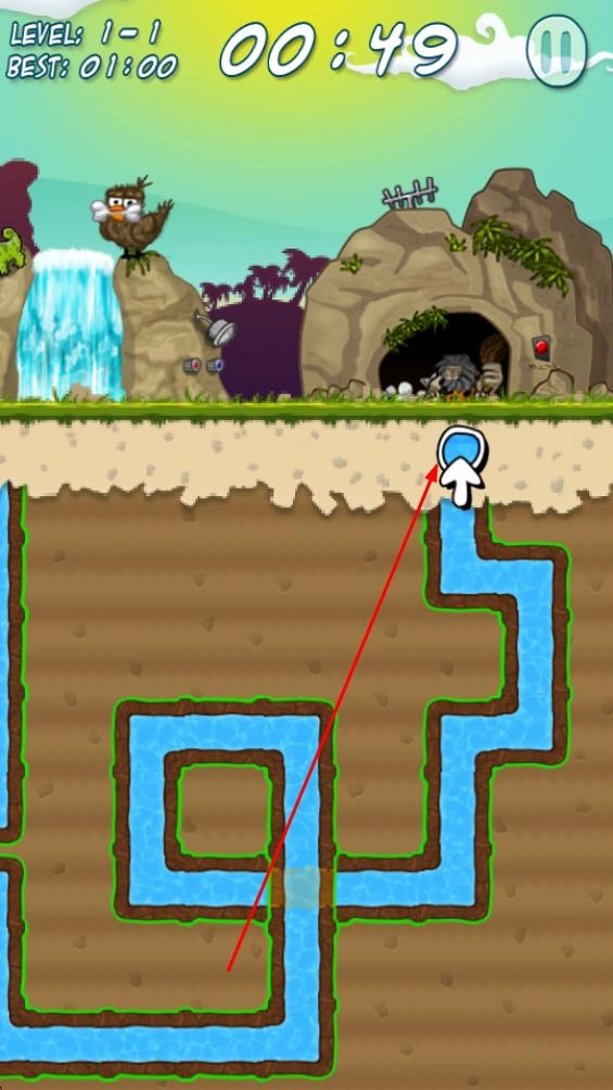 1、当进入像1 - 1、1 - 2这样的关卡时,通过挖掘土壤来开辟水渠的路线,引导诸如瀑布水流之类的水源流动,以此为后续的通水工作奠定基础。