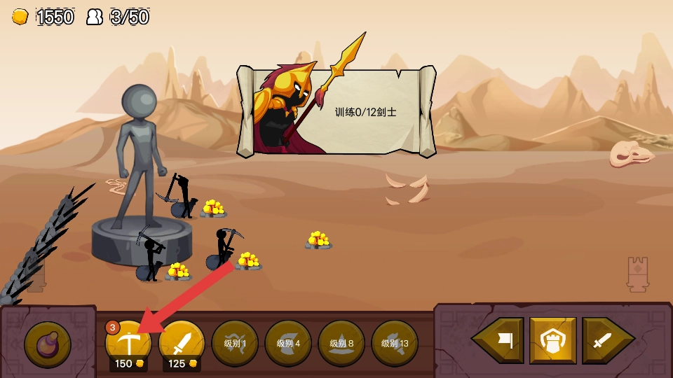 1. 游戏开始时,能够消耗125金币来训练剑士,依照提示循序渐进地完成训练并招募0/12名剑士的任务,以此组建起基础的战斗部队。