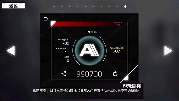 跟上节奏,以获取高分为目标(建议新手玩家从AWAKEN难度开启游戏)。
