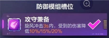 2、防御模组:兼具攻守能力,此模组显然应放置于防御槽位。在使用旋风冲刺后的三秒内,能够触发减伤被动效果,最多可减免百分之二十的伤害,且对榴弹炮的伤害减免高达百分之九十!