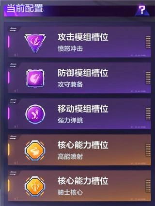 4、金色核心:高能喷射。选择高能喷射与骑士核心这两套模组进行搭配,能够激活亚瑟的三次突进能力。尽管每次突进的距离会有所缩短,但三次连续突进更易让敌人猝不及防。而骑士核心还可大幅提升亚瑟的移动速度与攻击速度。
