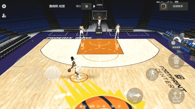 2. 转身运球操作:把左摇杆朝着前方推动,同时将运球杆从持球手的斜下方,滑动至非持球手的斜下方。