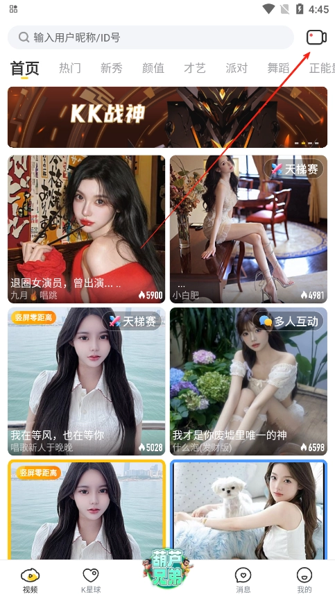 1. 打开kk直播平台的首页,然后点击页面右上角。