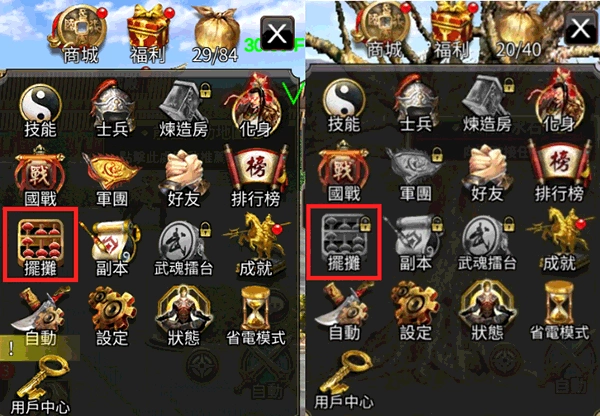 左侧已开启摆摊功能,右侧尚未开启摆摊功能。
