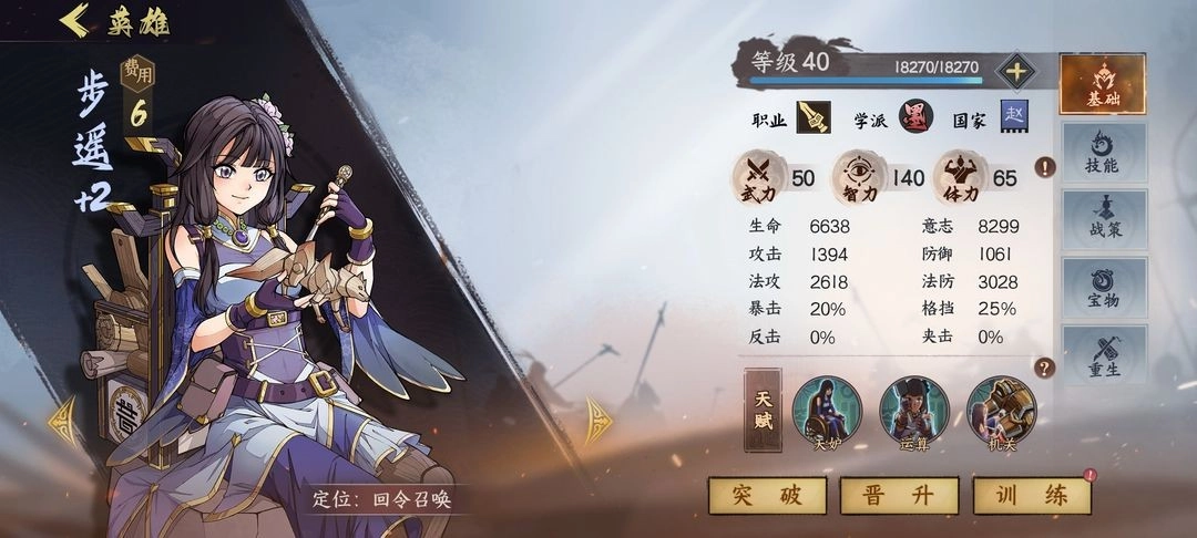 步遥是当前版本辅助角色里使用率比较高的一位。其一,它的智力属性很高,是为队伍回复军令、辅助战斗的关键角色之一。
