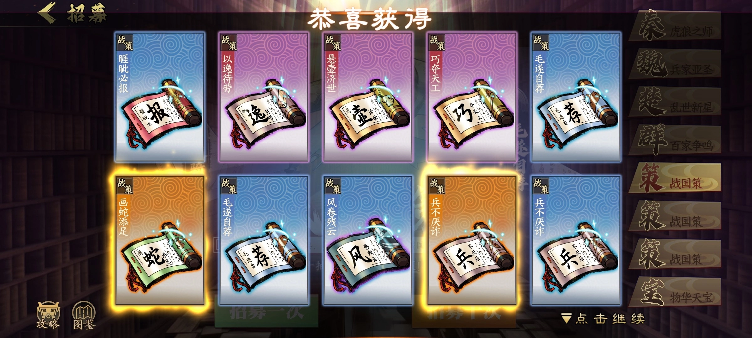 当完成主线任务并开启战策招募后,就可以在战策招募界面抽取战策。