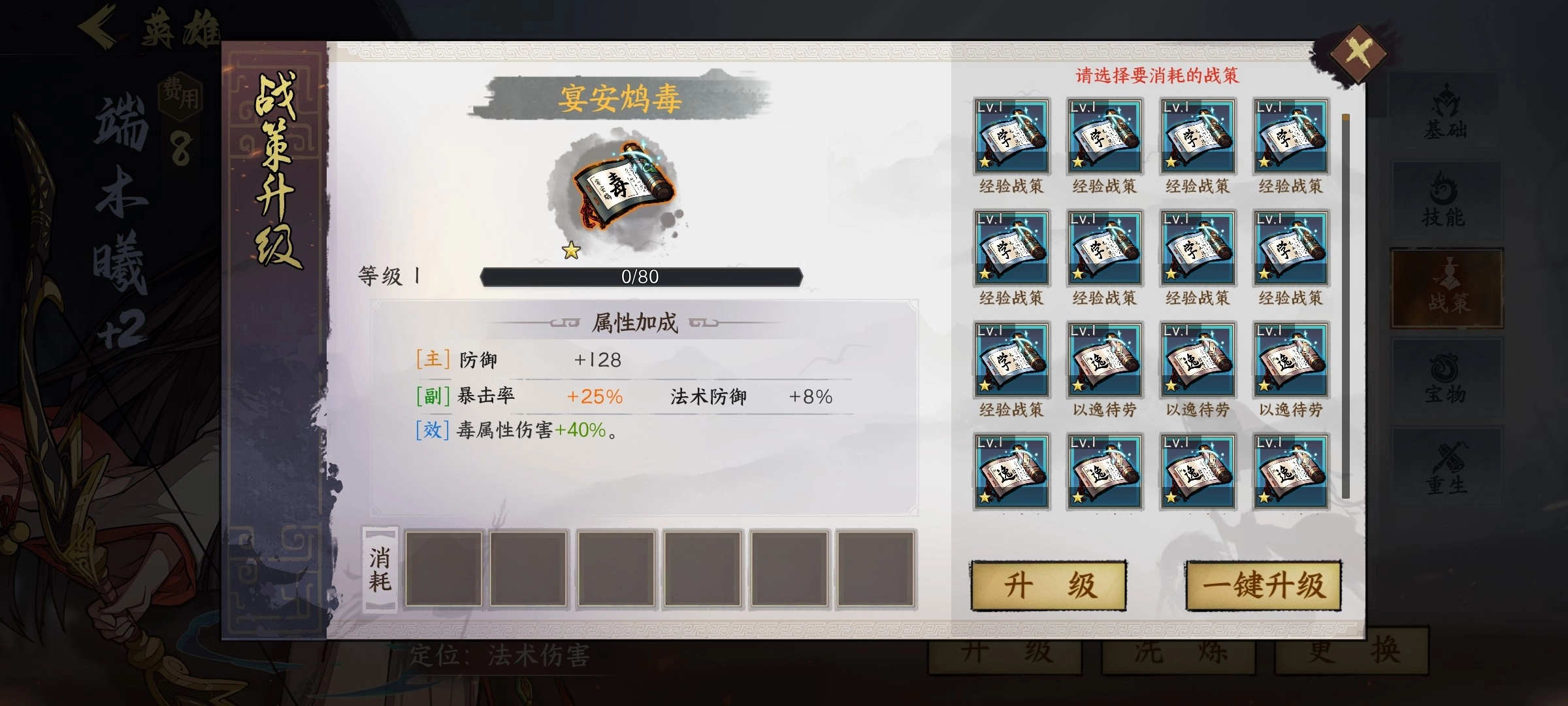 关于战策方面,建议不妨考虑让“宴安鸠毒”增添毒属性伤害。在主属性的选择上,推荐选取能增加法术防御的,如此一来,在使用蚩尤技能时,还可实现攻击力的转换增强。至于其他副属性,尽量挑选增加法术防御或者意志上限的,通过这种方式,能够全方位提升蚩尤本体以及端木瑛的强度。