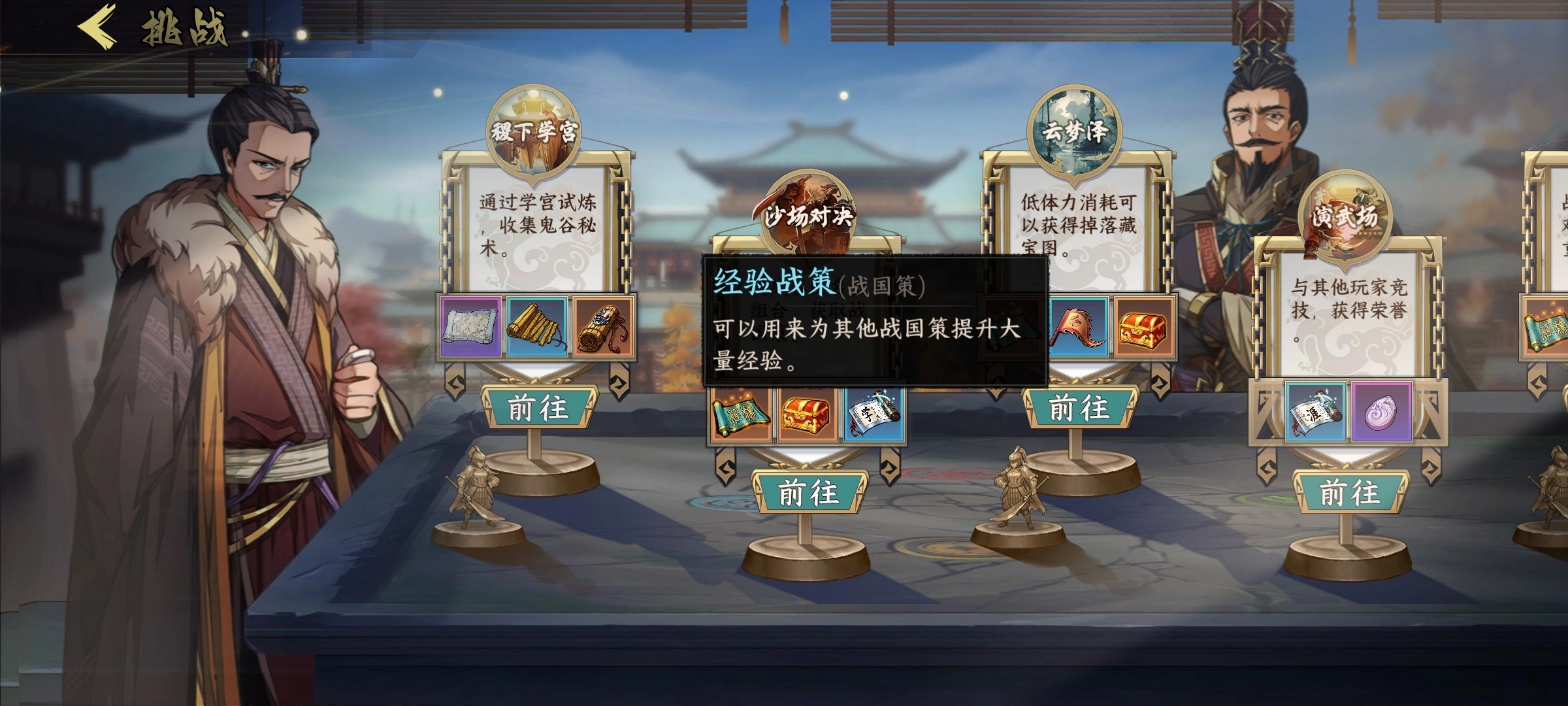 经验战策可提供大量经验,相比之下,其他战策增加的战策经验略少。经验战策可通过“挑战 - 决战沙场”玩法以及“军团活动 - 剧毒妖王”玩法来获取。