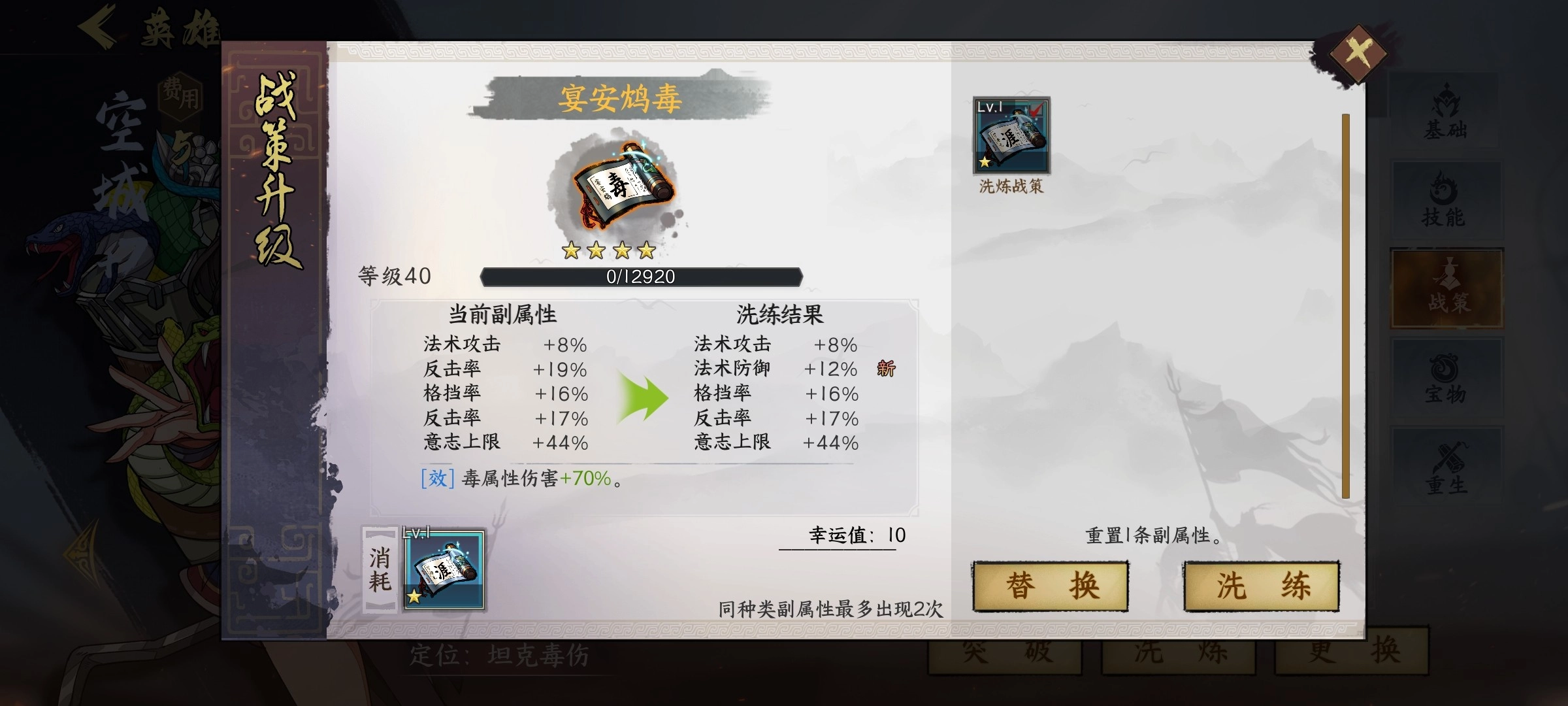 战策洗练时,会随机重置一条副属性,替换后能够覆盖原副属性。需注意,同种类副属性最多只会出现2条。各位玩家可依据英雄的特色定位,去选择强化英雄某一方面的能力,也能借助战策来补足其短板属性。说不定,由于战策属性偏向的差异,能让同一个英雄展现出不一样的战斗效果。