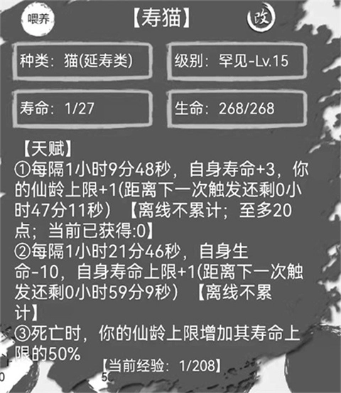 此外,前期推荐的灵宠为二阶寿猫(罕见级别),在所有五阶灵宠里,它是唯一能够稳定实现寿命量正向增长的灵宠。