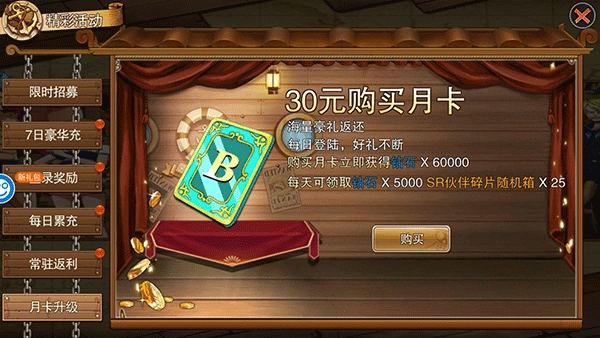 7、要是条件允许,不妨购买月卡或者永久卡,这样玩起来会更加舒适惬意。奶妈角色选择系统赠送的乔巴就好,应对PVE玩法的话,其奶量完全足够。每天坚持登录游戏,通过升星操作,乔巴自然能逐步升至满级。LR卡方面,累计登录30天会赠送白胡子,这个角色可以后期再进行培养。在前期,建议重点培养一个具有群体攻击能力的角色,以便更好地推进关卡。