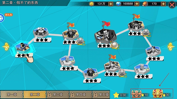 3、玩家除了要完成主线任务,还需完成冒险章节任务。每个关卡都能够收集三颗星星,当星星收集达到10个或者30个时,就能开启右下角的宝箱。
