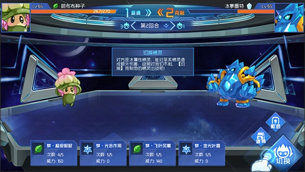 4、精灵之间存在属性相生相克的关系,你可点击切换精灵,针对性地应对,从而更有效地击败对手。
