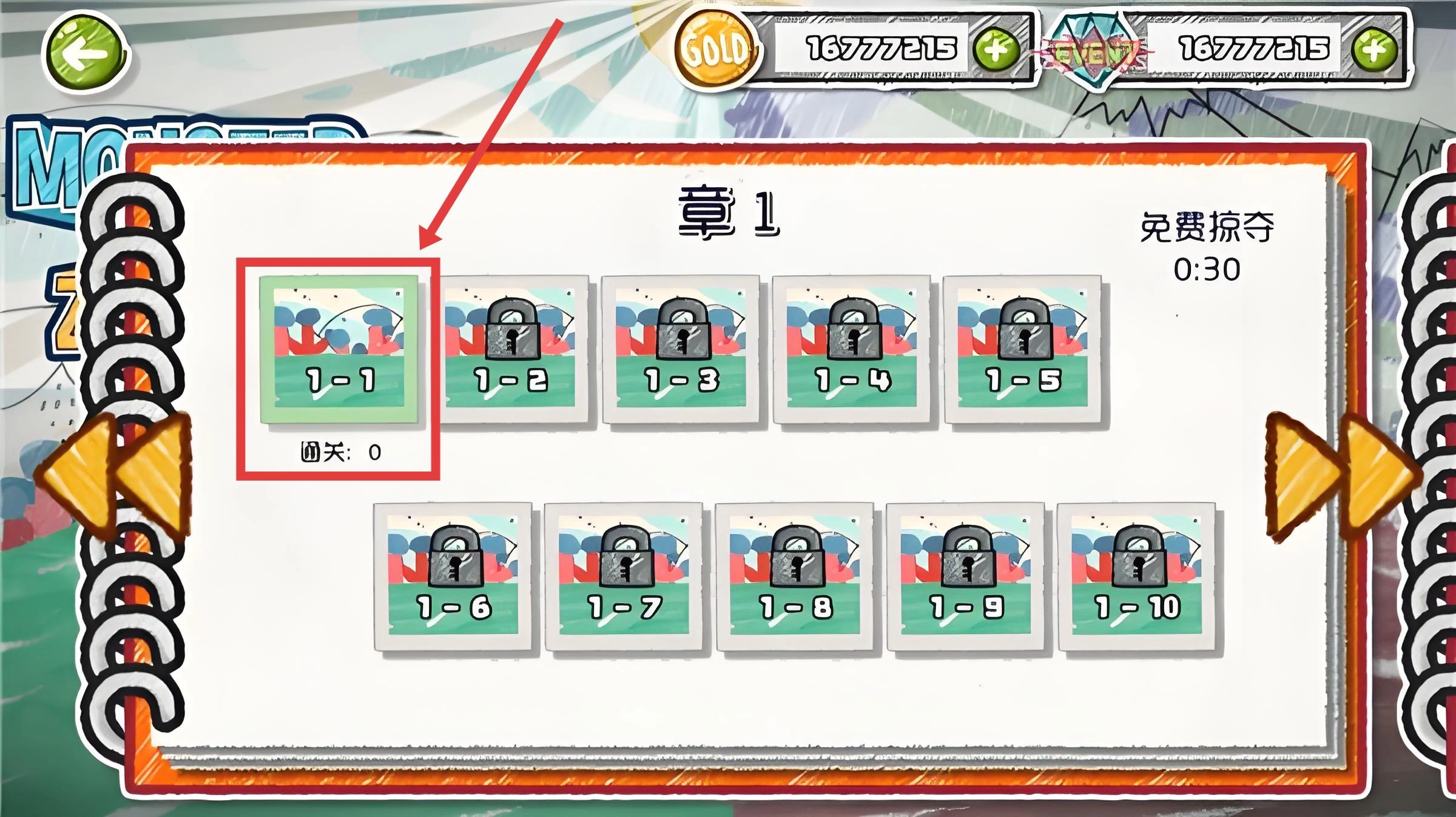 1. 玩家进入游戏之后,点击指标方框中的【1 - 1】,就能进入游玩。