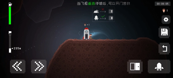 4、游戏玩法为向各个小区域发射火箭,每个区域都可能存在幸存者,你要把他们解救出来。待飞船平稳停靠后,左边红色箭头所指的燃料会自动恢复。