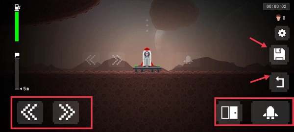 3、下面为大家介绍基本功能键。左边的是左右方向键,其作用是控制火箭方向;右边是开舱门按钮与发射按钮。红色箭头所指的功能,一个是返回初始状态,另一个则用于存档。