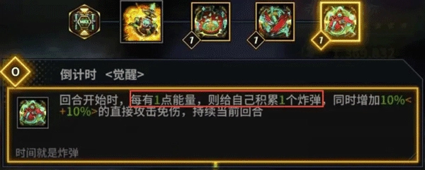 能量技能:在回合开始之际,自身每拥有1点能量,便为自己累计1枚炸弹。