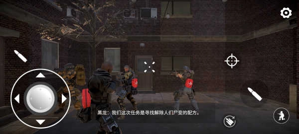 4、进入游戏后,通过左摇杆操控角色移动,滑动屏幕来调整视角。屏幕左右两侧设有子弹相关操作,十字星按钮用于瞄准,右下角的人物标志则能切换射击模式。