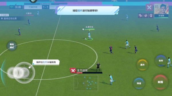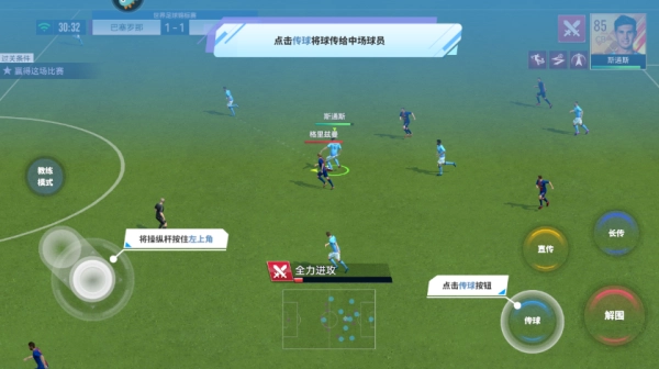 2、传球解析:通过操纵杆来控制角色移动,点击传球即可完成传球操作。