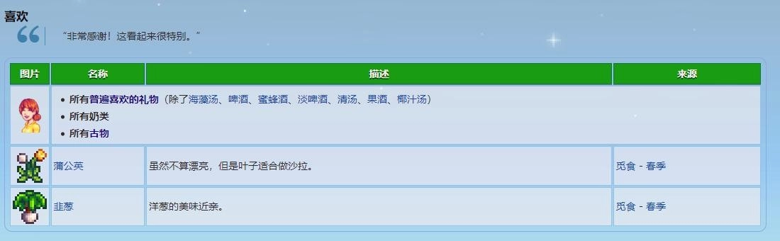 二、喜爱的礼物:蒲公英、韭葱,包含羊奶和牛奶在内的所有奶类,古代玩偶等全部谷物,还有游戏中NPC普遍青睐的礼物。